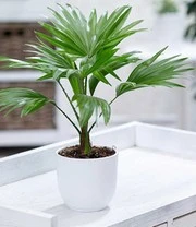 De palm ‘´Livistona Rotundifolia ook bekend als schermplant, ontvouwt haar groene waaiers en plaatst deze zijdelings als een scherm, vandaar ook de naam. Als u de palm Livistona Rotundifolia op een lichte, niet zonnige plaats zet, voelt ze zich het prettigst. Vooral in het bureau of in huis schept u zo een weldoende oase. De kamerplant groeit overzichtelijk en woekert niet. Na verloop van tijd wordt ze pas groter en is daarom ook geschikt voor een kleinere kamer. De groene planten verwijderen schadelijke stoffen uit de lucht en zuiveren de lucht. Ze produceert zuurstof en bevordert zo het klimaat in huis.