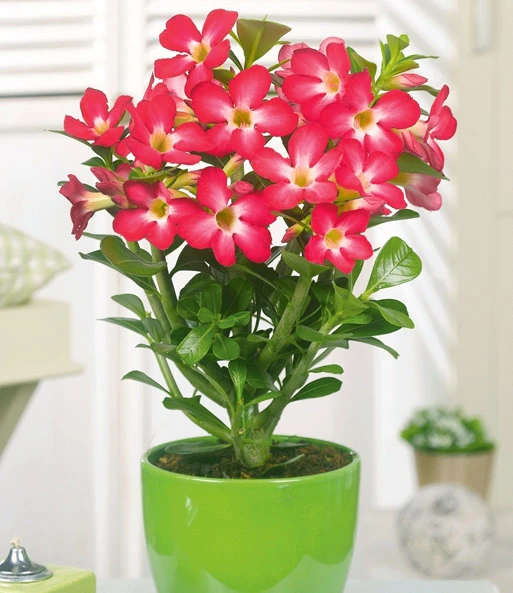 Rode woestijnroos: De rode woestijnroos is zeer exotisch en rijkbloeiend in uw huis. De bloemen gaan lang mee en dat maakt deze beauty zo decoratief! Een kamerplant waar u jarenlang plezier van zult hebben en die dankzij zijn interessante groeivorm steeds mooier wordt.(Adenium obesum)
