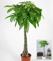 Een echte geluksgreep! De decoratieve pachira Aquatica ook bekend als watercacao, is afkomstig uit Zuidamerika en behoort tot de familie van de wolbomen. Het mooie kamerboompje met zijn bijna horizontal groeiende, frisgroene bladeren, die een mooie boomkroon vormen, is een heerlijke blikvanger voor in huis of op kantoor. Volgens de leer van de Chinese Feng Shui, grijpen de bladeren, die er met een beetje fantasie op handen lijken, het geluk en houden het vast in het gedraaide stammetje. In Azië wordt de geliefde kamerplant ook geldboom genoemd. De plant is een traditioneel cadeau bij de inwijding van een huis, omdat ze geluk en welvaart in huis zou brengen.