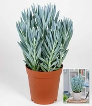 De moderne kamerplant senecio Aquarine® Mount Everest is werkelijk een bijzondere blikvanger voor in huis of op kantoor! De grijsblauwe waslaag op de cilindervormige bladeren geven haar een bijzonder allure. De senecio Aquarine® Mount Everest kan goed met andere planten worden gecombineerd, maar heeft ook genoeg statuur om in zijn eentje de show te stelen. Zowel binnen als ook op het terras zal ze prachtig gedijen. Ze past heel goed in potten, vazen en bakken in bonte kleuren en verschillende materialen.