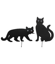 Met de vogelverschrikkerset poezen houdt u ongenodigde gasten uit uw tuin. Of het nu brutale vogels zijn of de huisdieren van de buren, de zittende en aansluipende katten, vervaardigd van zwart gelakt metaal met de fonkelende glazen knikkerogen verdrijven deze bezoekers. De vogelverschrikkerset poezen bezit een pen die op de gewenste plek in het tuinperk, op het gazon of in de voortuin kan worden gestoken. Vogels houden van kersen en bessen uit de fruittuin, maar het de vogelverschrikkerset poezen zijn decoratieve vogelverdrijvers.