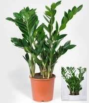 Met deze kamerplant kunt u nauwelijks iets fout doen. De Zamioculcas is een heel eenvoudig te onderhouden kamerplant. De kamerpalm is oorspronkelijk afkomstig uit Oostafrika waar ze net als in huis ook een wekenlange droogte gemakkelijk verdraagt. Dit kan de Zamioculcas dankzij de verdikking onderaan de steel die als wateropslagplaats dient. Deze kamerplant is heel geschikt voor een half hoge pot!